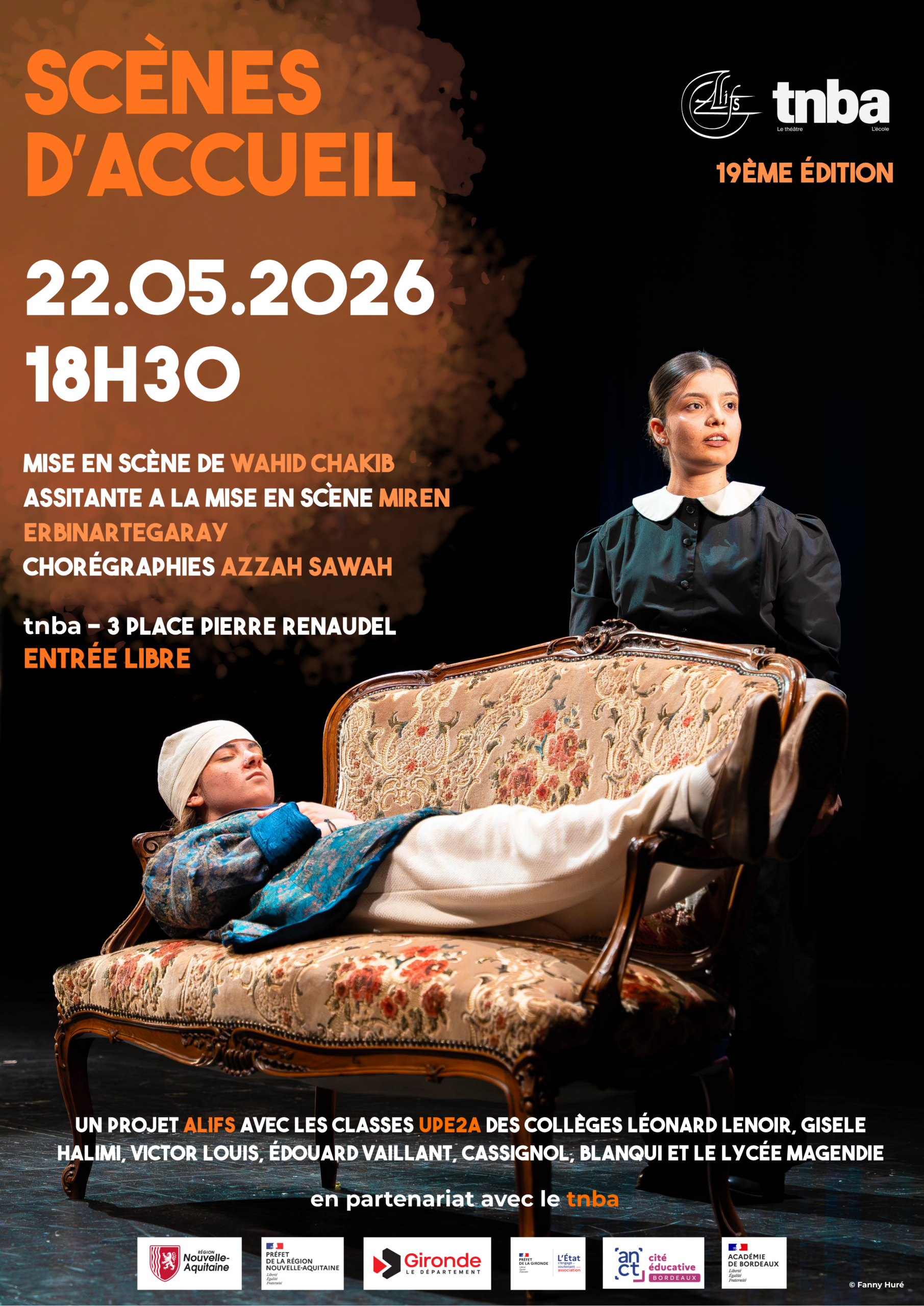 Le 22 mai prochain, le tnba accueillera la 19ème édition du festival Scènes d’Accueil, un événement mettant en lumière le travail de 7 classes UPE2A issues de plusieurs établissements girondins : le Collège Léonard Lenoir (Bordeaux), le Collège Gisèle Halimi (Mérignac), le Collège Victor Louis (Talence), le Collège Edouard Vaillant (Bordeaux), le Collège Cassignol (Bordeaux), le Collège Blanqui (Bordeaux) et le Lycée Magendie (Bordeaux).
